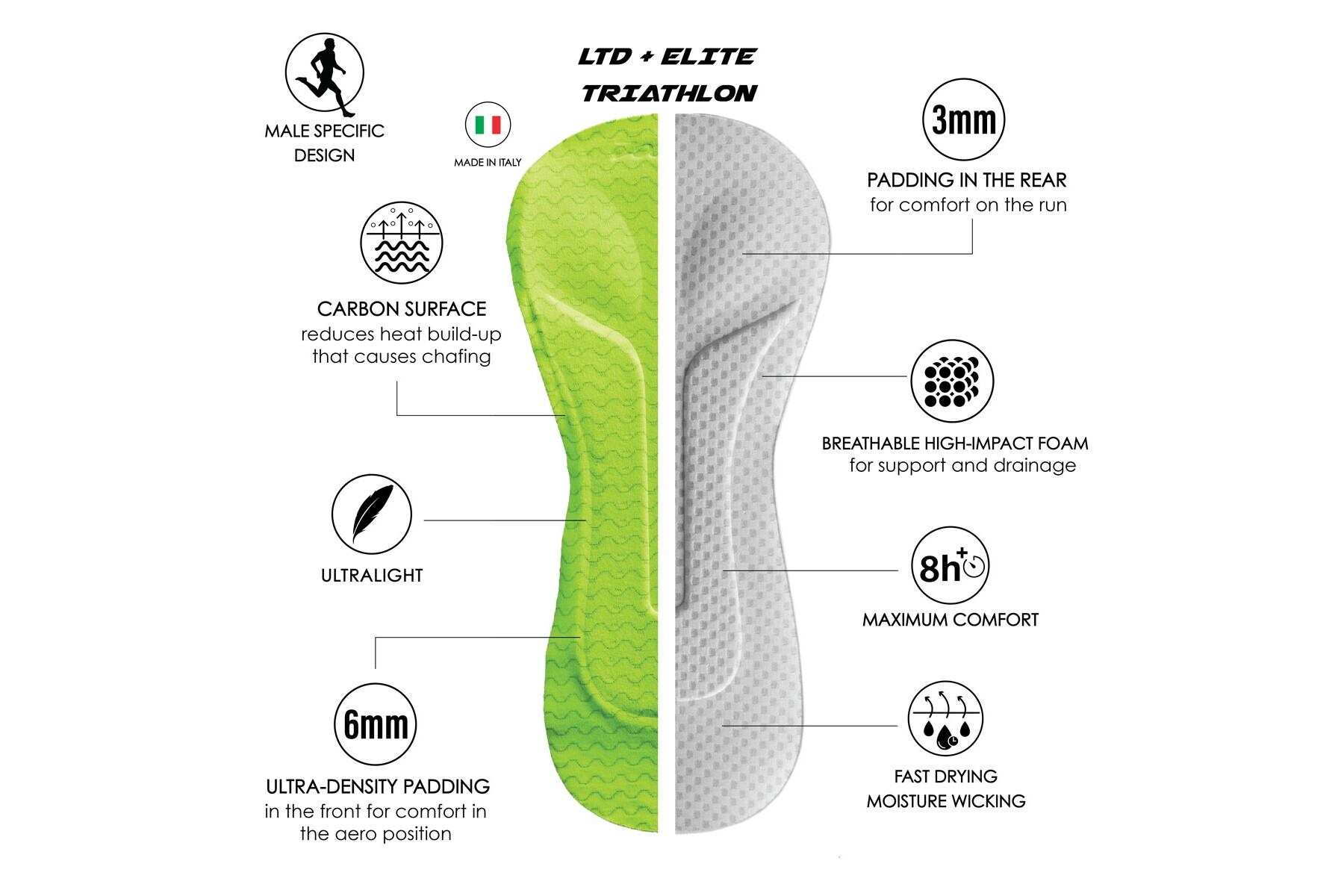 トライアスリート専用に設計された PRO CARBON TRI シャモアは、エアロポジションで長時間過ごす際の保護性を高めるようデザインされています。独自のマルチサポート構造により、低いエアロなトライバイクの姿勢でサドル先端側に発生しがちな圧力ピークを解消します。さらに、この軽量でスリムフィットなトライ用パッドは最大限の可動性を確保し、スイムやランの際にはパッドの存在を「感じさせない」よう設計されています。
